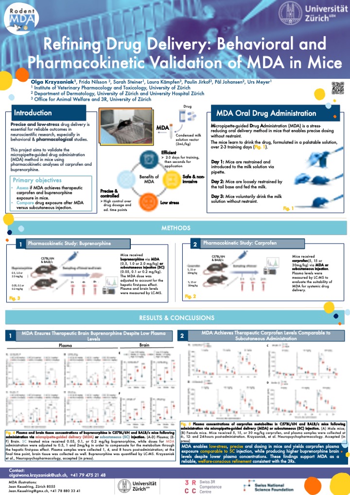 Download hereWhat is Rodent MDA and what is our research project actually about? This poster presents our NRP79 funded research project "Minimizing Stress and Harm for Laboratory Rodents in Oral Drug Treatments Using the Micropipette-guided Drug Administration (MDA)". Feel free to download and read through it.